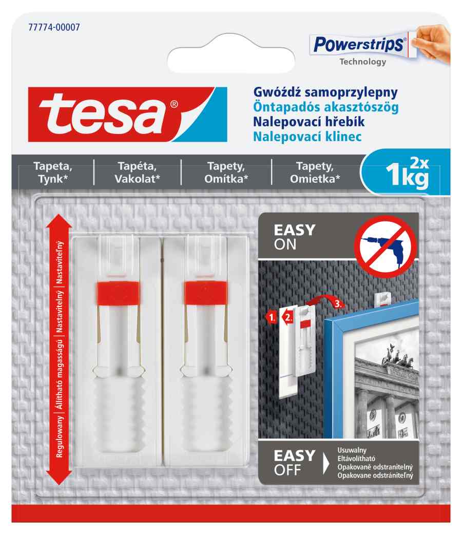 Lepicí proužek Powerstrips® na tapety a omítku je složen ze tří vrstev. Jednu vrstvu tvoří lepidlo určené speciálně na citlivé povrchy, druhá silnější vrstva slouží k připevnění lepeného předmětu a mezi je vložená tenká pěna. Výsledkem je proužek, který vyrovnává drobné nerovnosti a zajišťuje bezpečné držení na omítce a choulostivějších površích. Nalepovací hřebík na tapety a omítku je zejména vhodný pro připevňování různých dekorací a obrazů. Pomocí nalepovacího šroubu zase připevníte různé cedulky a oznámení. Na výběr je více variant dle nosnosti od 0,5 kg do 2 kg / jeden háček.