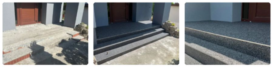 Finální vrstvu tvoří kamenný koberec PerfectSTONE v mramorovém odstínu antracit, s frakcí kameniva 2 až 4 milimetry. Tato barevná varianta působí decentně, přitom elegantně a podtrhuje moderní styl domu. Povrch je příjemný na dotek, odolný vůči opotřebení a snadno se udržuje v čistotě.