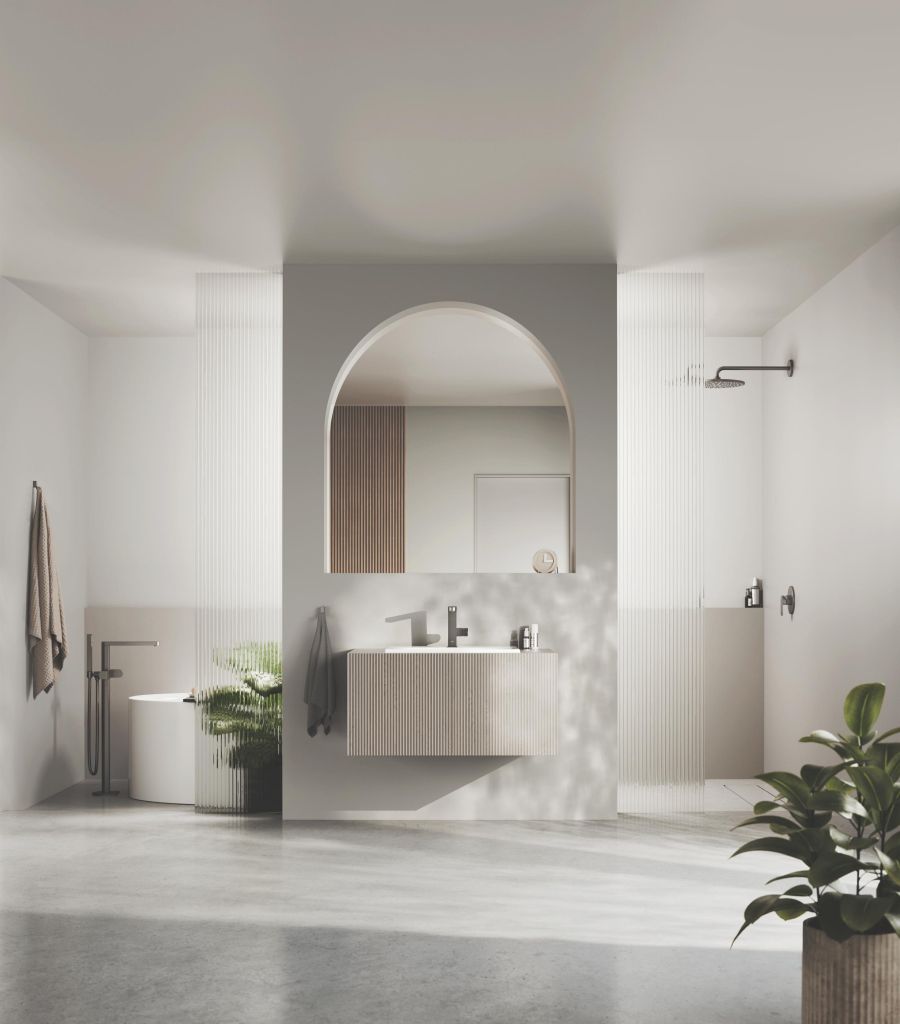 Univerzální elegance: Páková baterie GROHE Plus v novém designu spojuje kulaté a hranaté tvary, díky čemuž dokonale ladí s širokou škálou koupelnových stylů.