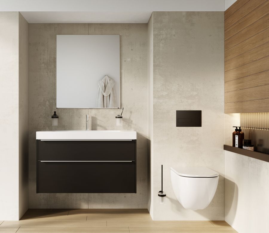 Foto: Kombinace umyvadla s podumyvadlovou skříňkou Pure značky JIKA v sofistikovaném tmavém provedení upoutá pozornost a vhodně doplní nejen minimalistické interiéry. Skříňka kromě svého designu potěší také praktickým zpracováním, díky němuž nabízí dostatek úložného prostoru.