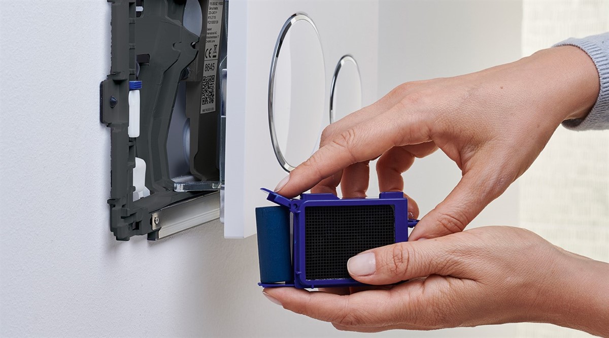 Zatím co osvěžovače vzduchu dočasně pachy maskují a skrz otevřené okno vniká dovnitř studený vzduch, jednotka odsávání zápachu Geberit DuoFresh funguje bez jakýchkoliv vedlejších účinků. Jednotka na odsávání zápachu je výhodná v mnoha směrech. Vzduch se odsává přímo z keramické mísy a vrací se zpět do místnosti až po vyčištění ve voštinovém filtru. Jednotka DuoFresh se dá snadno nainstalovat do nádržky Geberit Sigma a kombinovat prakticky s téměř všemi tlačítky ze sortimentu Sigma.
